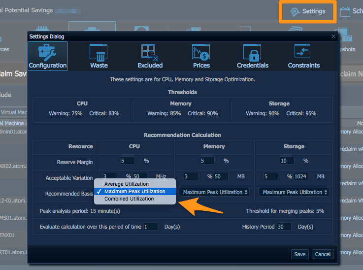 This is where sysadmins are able to granularly set how recommendation metrics are calculated for right-sizing. Default Optimizer metrics are based on Maximum Peak Utilization and can be easily modified to Average or Combined Utilization metrics.