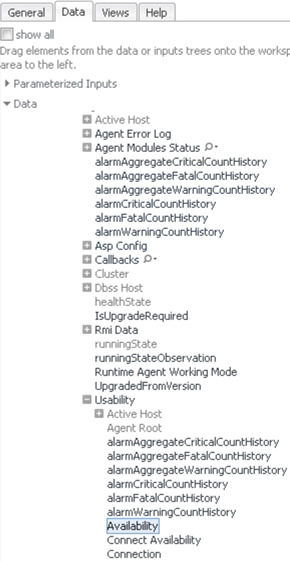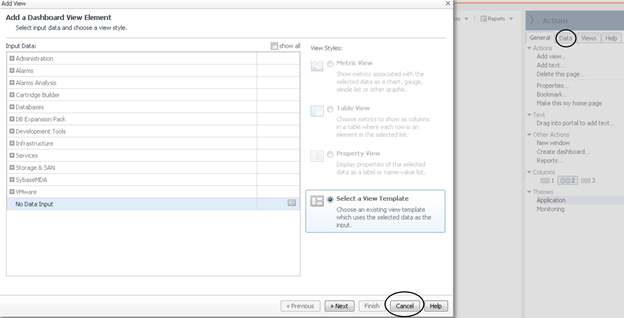 Step 4: This screen is displayed to start choosing data but I prefer selecting Cancel and then dragging and dropping data from the Data tab list. In this example, I am selecting and dragging the Availability metric to the left onto the blank dashboard.