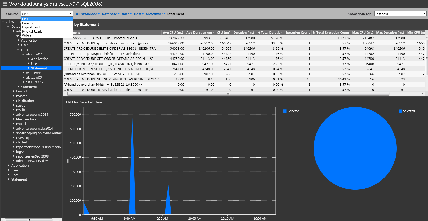 Here is a sample Workload Analysis interface in Spotlight that allows users to perform ‘dimensional drilldowns’ by database, application, user, host or statement for custom time frames.