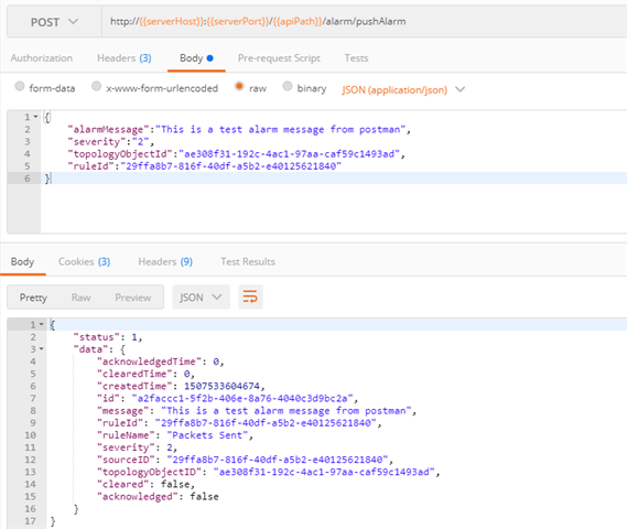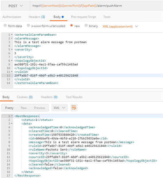In order to use this REST API, you need to provide alarm related configurations including Alarm Message, Severity, Topology Object ID and Rule ID. Rule ID is optional, instead we will use “ExternalAlarm”. It support both XML and JSON format.