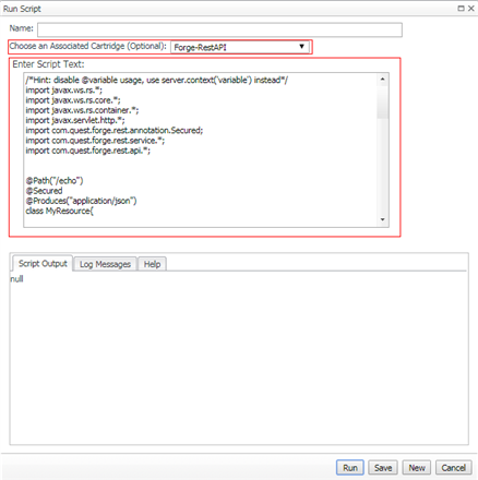 - Choose “Forge-RestAPI” in the “Choose an Associated Cartridge (Optional)” dropdown list. Then copy and paste your groovy script of this REST API server code to “Enter Script Text”. Finally click “Run” button. If you see the null as the Script Output, then it executes successfully.