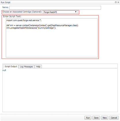 - Choose “Forge-RestAPI” in the Choose an Associated Cartridge (Optional) dropdown list. Then copy and paste your groovy script of this REST API server code to “Enter Script Text”. Finally click “Run” button. If you see the null as the Script Output, then it executes successfully.