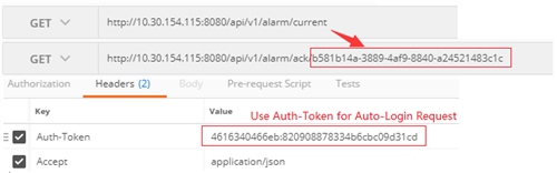 Then we use the auth-token (Please refer to Auto-Login section) to help us to do the request for alarm acknowledgement.