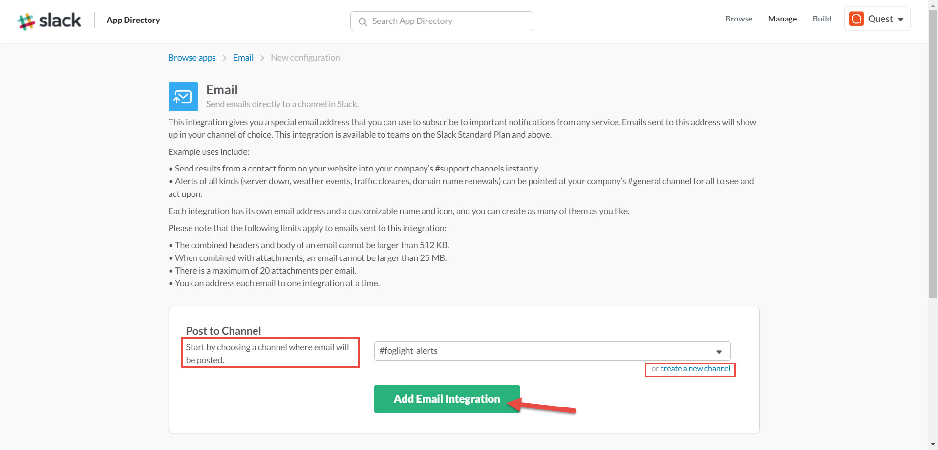 Once you have received approval to use the slack email integration, you can add an email integration to your slack channel. Either pick a channel from the list, or create a new channel.