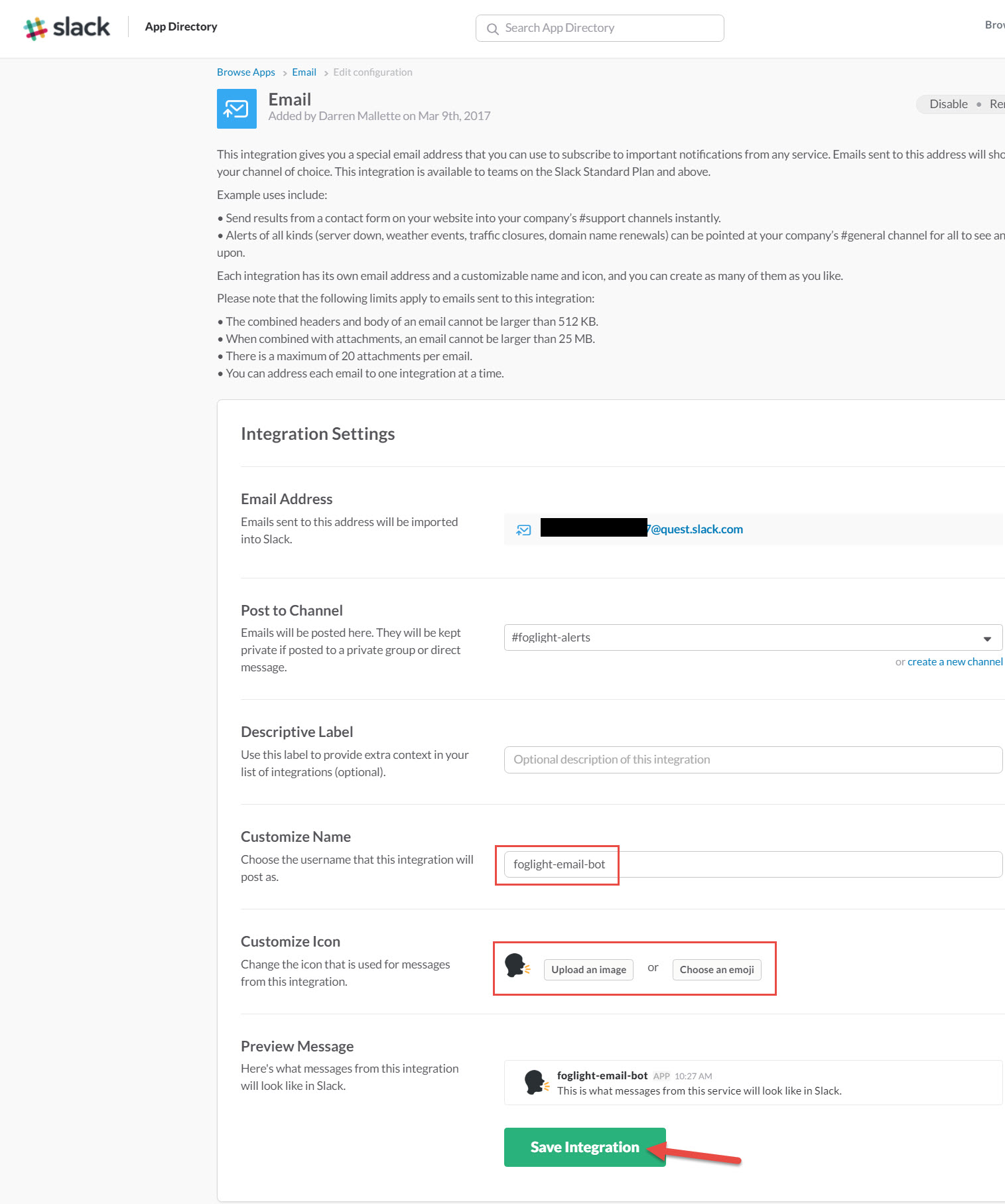 You can then customize the name that will post to your channel, and add an icon or emoji. Save the integration once complete.