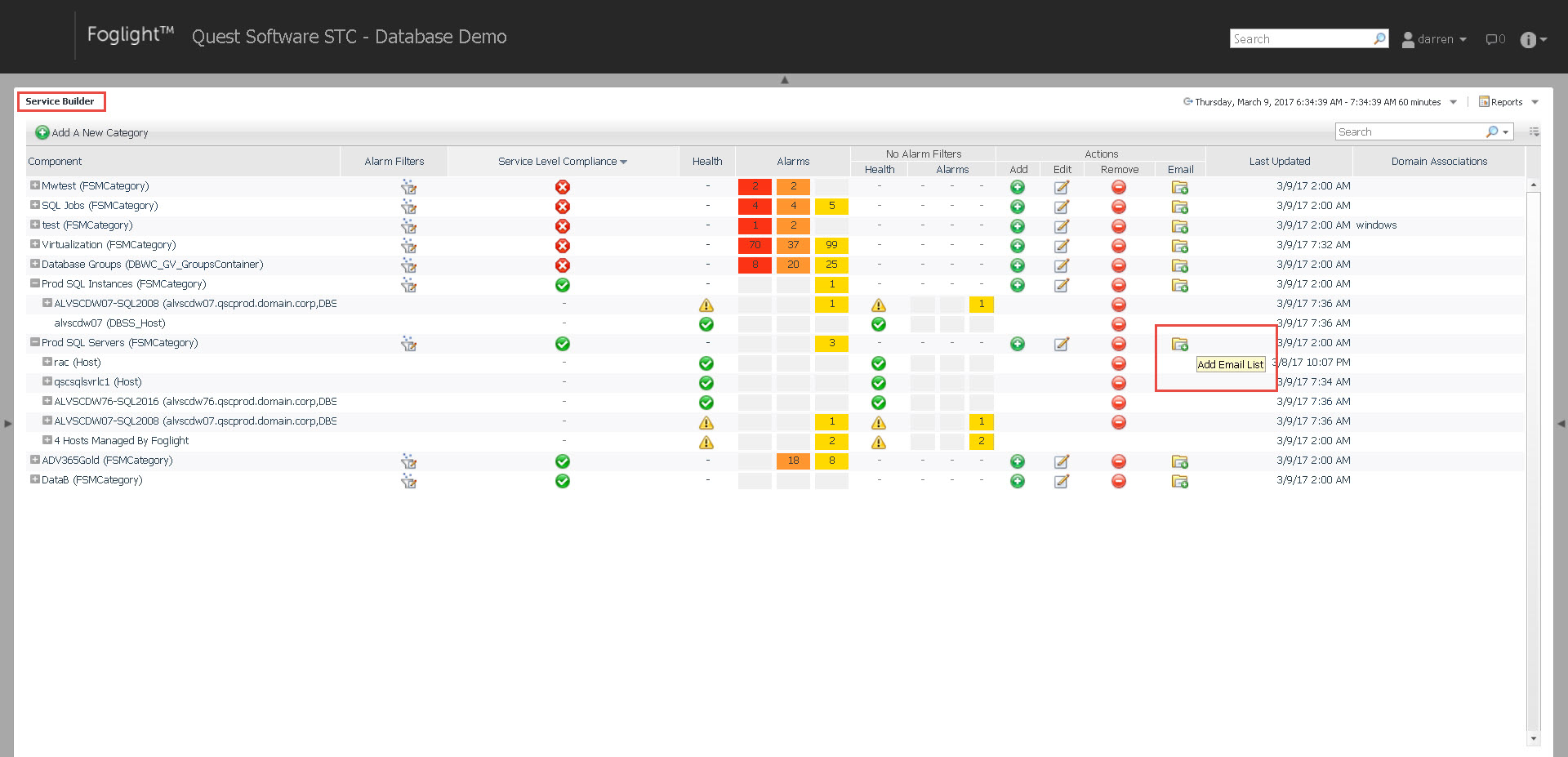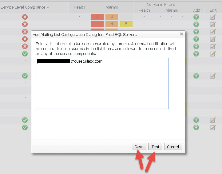 For this use case, I just want a summary email when alarms are raised on a service (a grouping of “things” that Foglight monitors). Test then save the email setting.