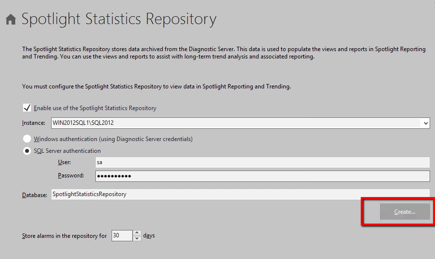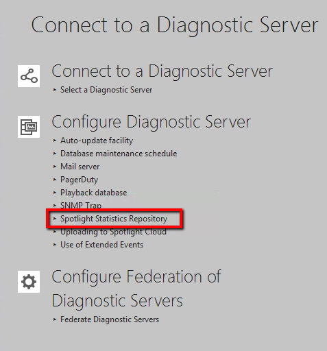 The initial installation of Spotlight on SQL Server Enterprise creates the Diagnostic Server, the Playback Database, and the Spotlight Console. The Diagnostic Server collects data and stores data into the Playback Database for granular, historical analysis. The Spotlight Console is used to view the collected data. This may seem obvious to many of you, but I don’t like to make too many assumptions. Reports are populated using data collected by the Diagnostic Server, but the data is stored into the Spotlight Statistics Repository. This is another database that you must create and configure after the initial installation.