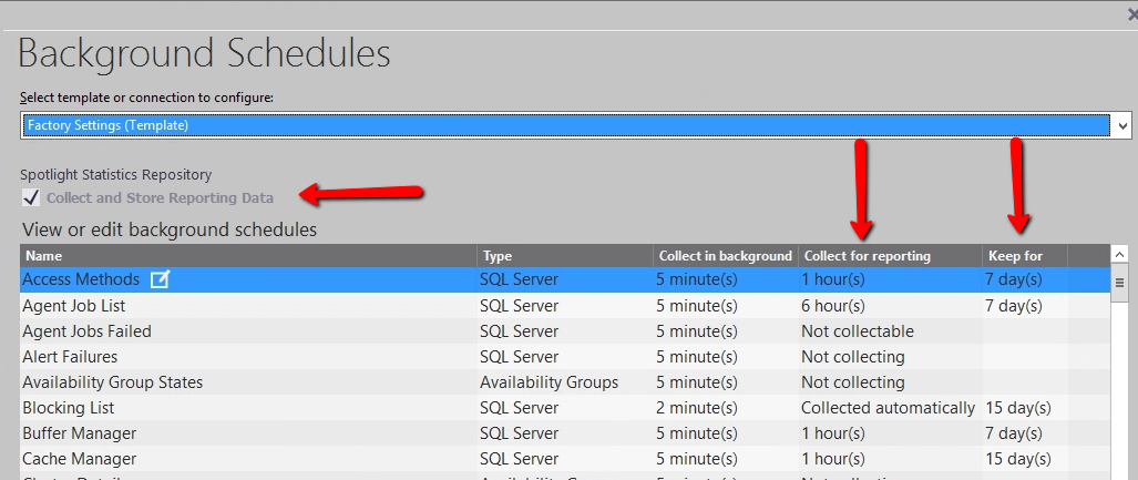 As you might already know, Spotlight collects data on scheduled intervals. The intervals are defined in the Configure->Scheduling menu: