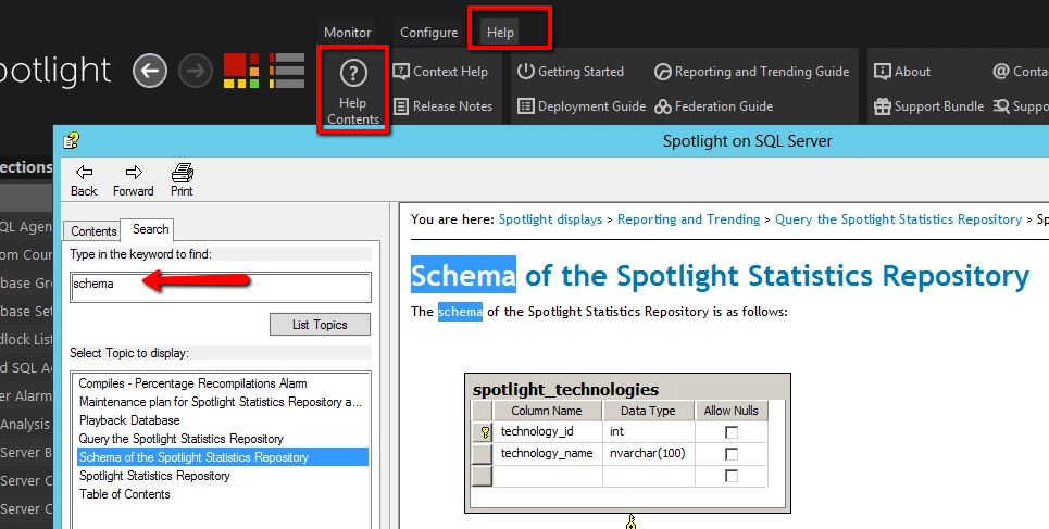 If you open a few different files, you’ll start to get a sense of RDL syntax as well as the data model of the Spotlight Statistics Repository database that feeds the data used in reporting. However, you don’t need to reverse engineer the data model. We document this within the Spotlight console. Navigate to the Help menu->Help Contents, and type “schema” into the search box:
