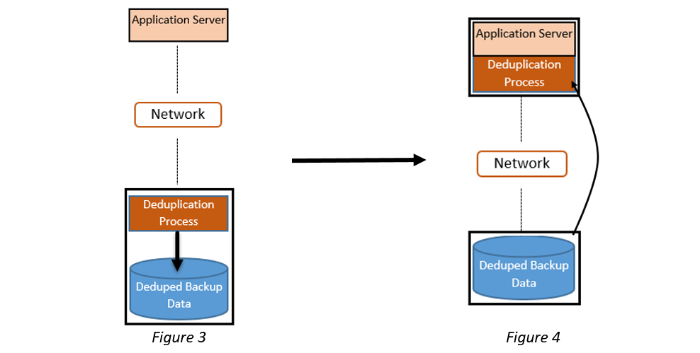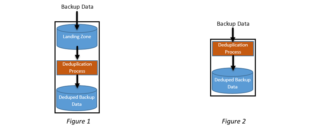 An in-line deduplication PBBA immediately deduplicates data in memory before it is written to disk. The in-line deduplication method is shown in Figure-2. Both processes appear to be similar, but differ in when the deduplication process is applied.