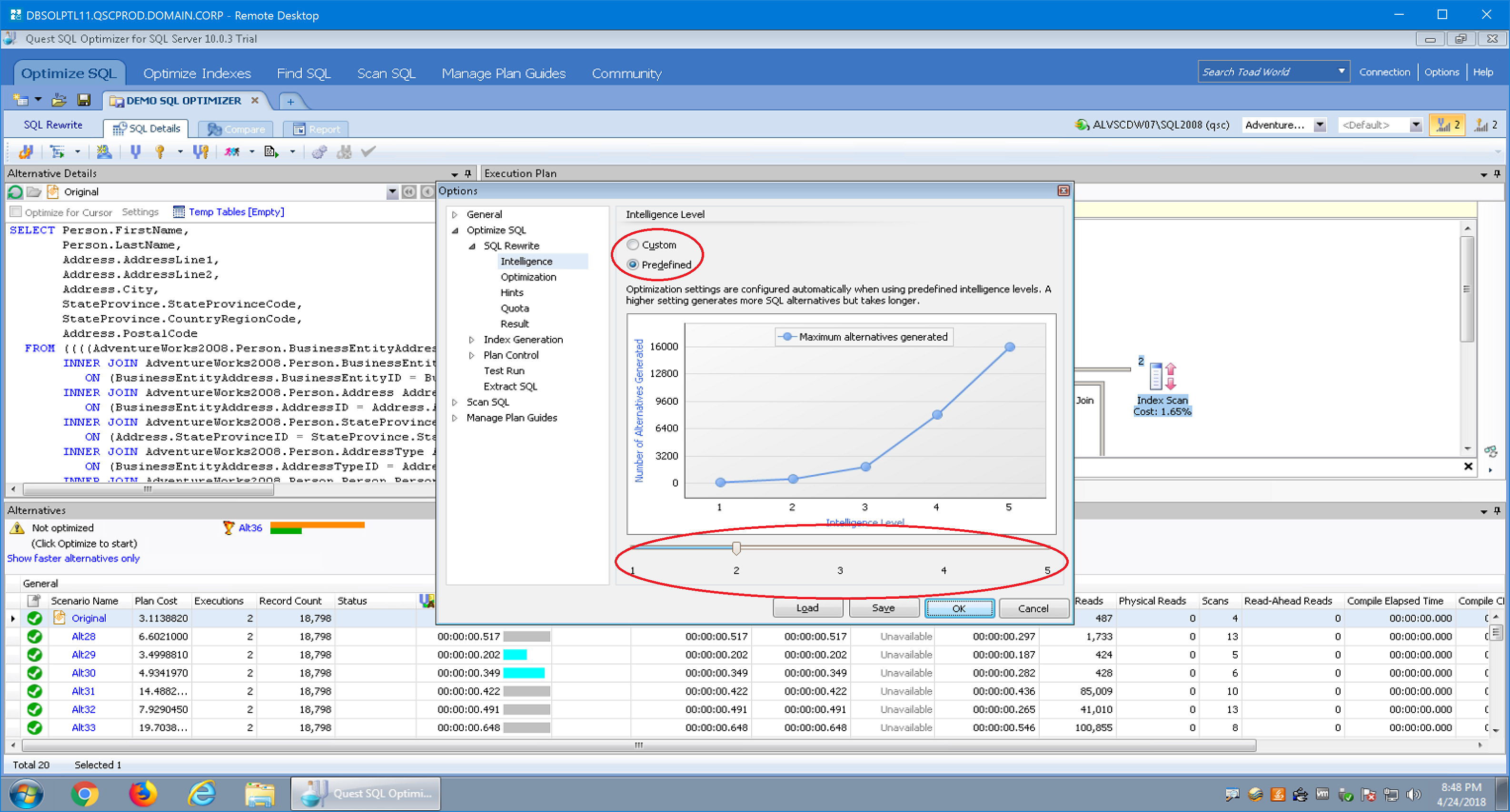 First, note the options in the top right corner referred to as “Intelligence Levels” for both SQL Optimization and Index Generation.