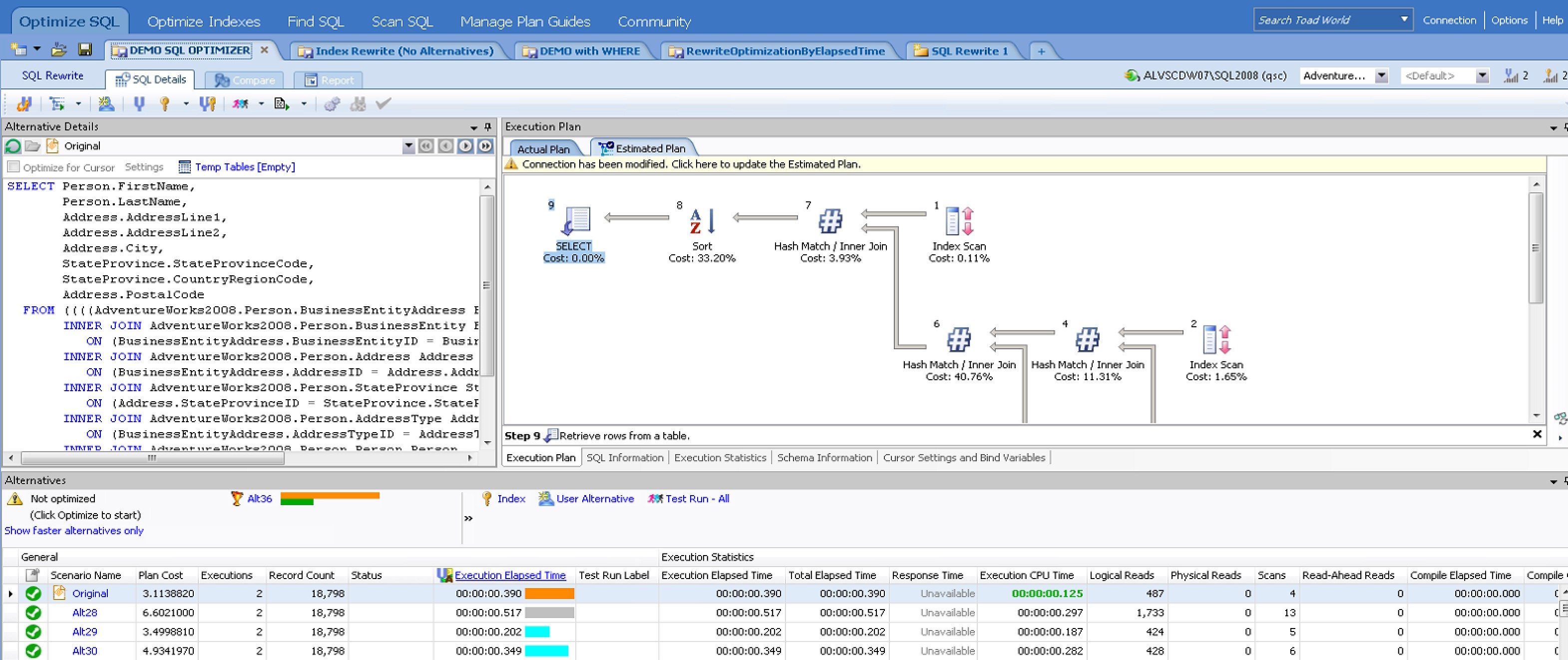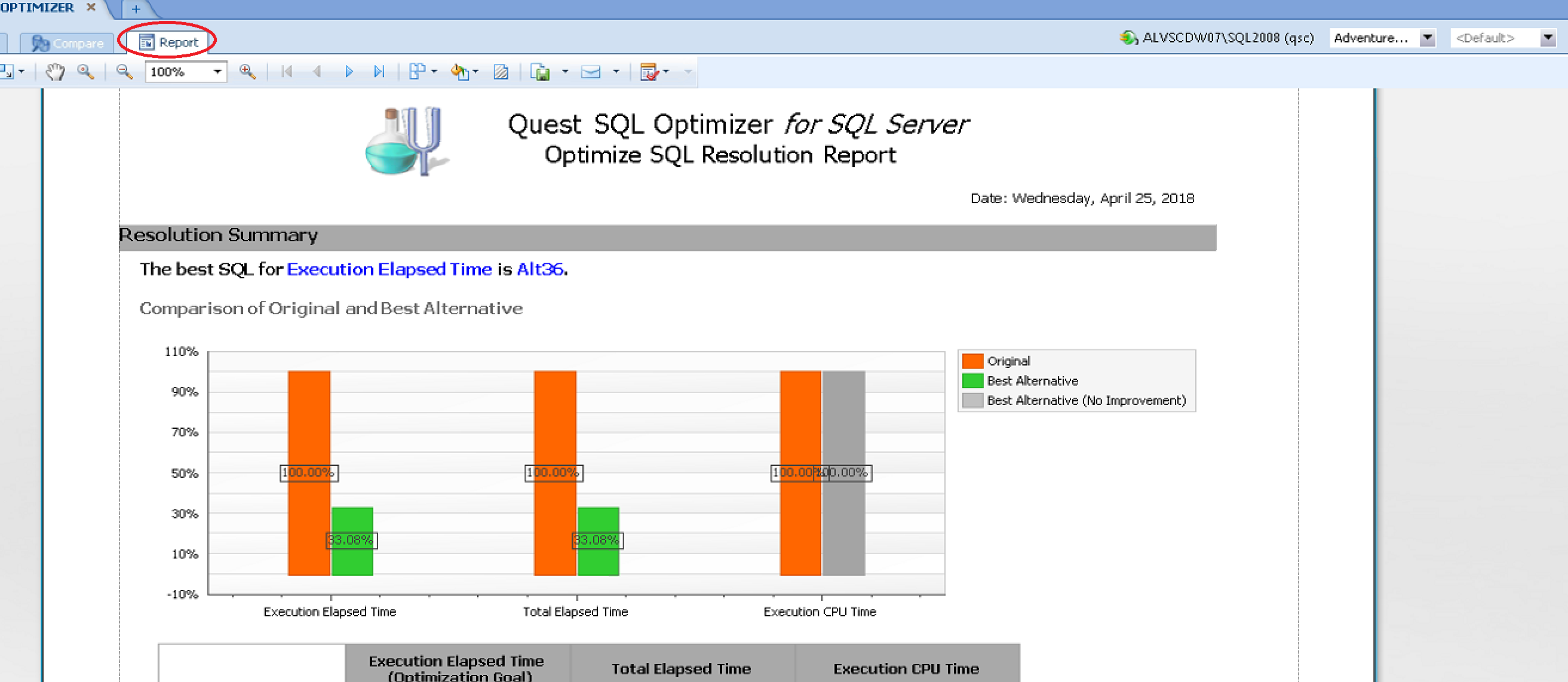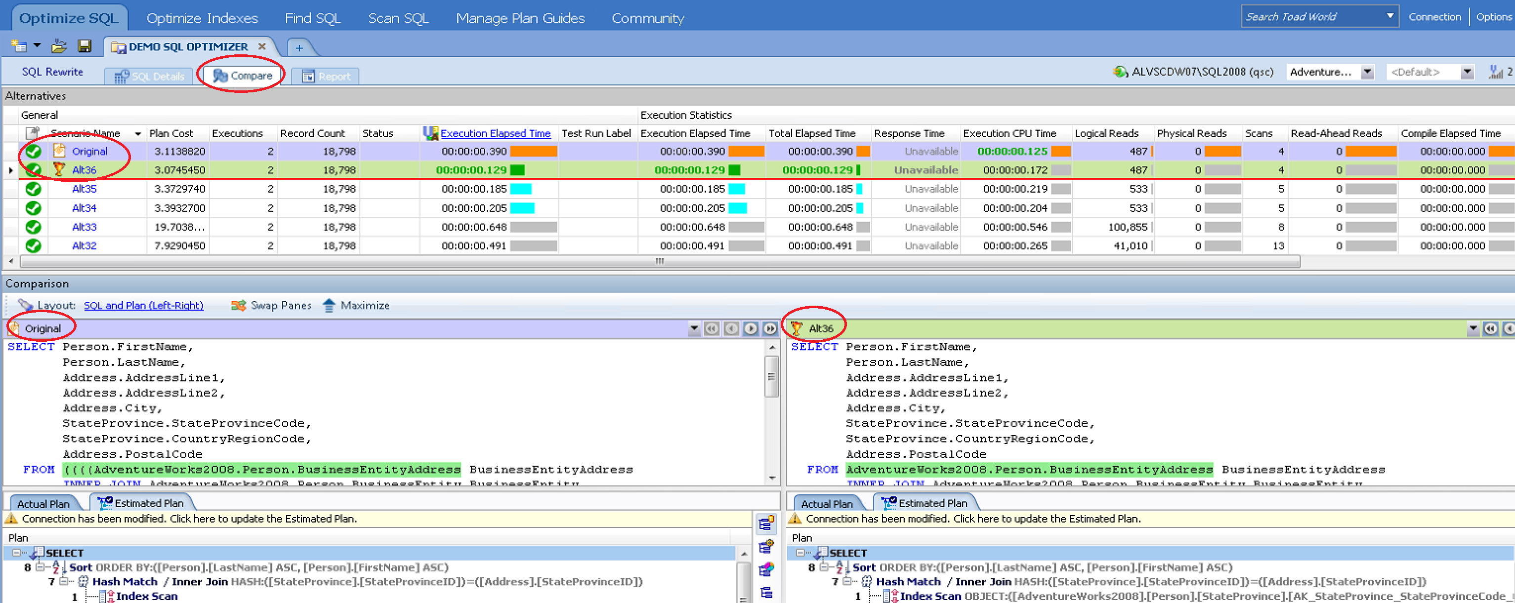 From here, you can view a side-by-side comparison of the best alternative (both SQL and Plan) to your original SQL Statement by choosing the ‘Compare’ tab.