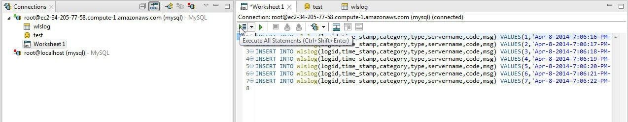 Next, we shall add data to the wlslog table. Table data may be added by running a SQL Script with DML statements as shown in Figure 27.