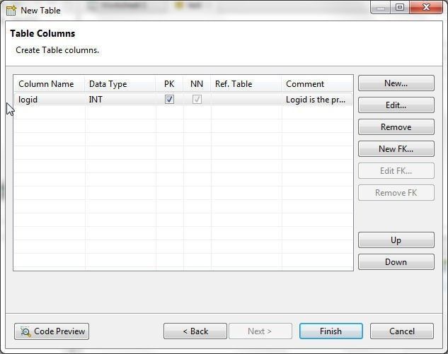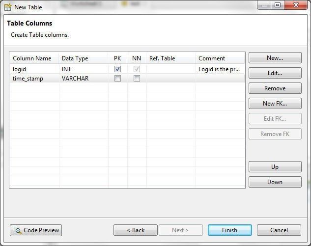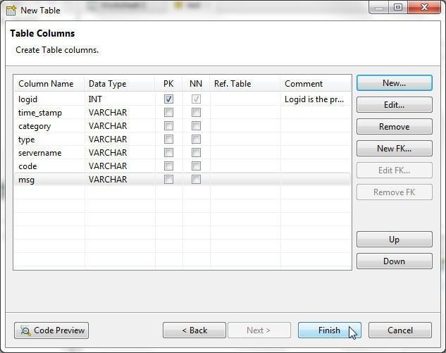 Addlogid, time_stamp, category, type, servername, code, and msg columns to the table. Specify a column name (logid) and select a Data TypeINT as shown in Figure 16.