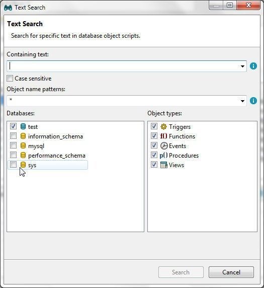In Text Search the databases listed may be searched for database objects from the Object types selected, as shown in Figure 7.