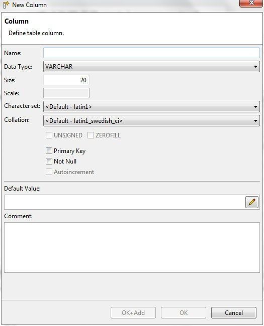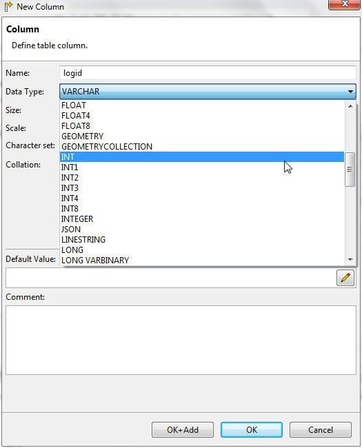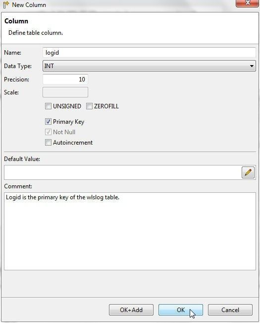 Different data types have different additional fields for which a value must be specified. For data type INT specify Precision (10 is default). Select the Primary Key checkbox to make the column as the primary key. A primary key is Not Null by default. Optionally a Default Value and Comment may be specified. Click on OK as shown in Figure 17.