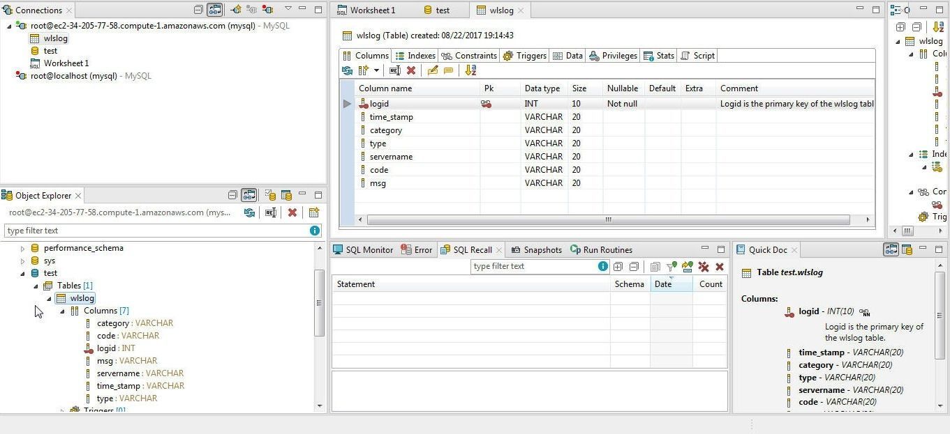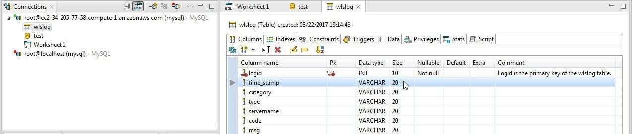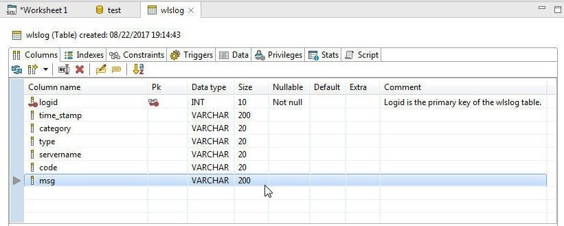 Similarly, increase the column size for the msg column. The Column sizes for the time_stamp and msg column are shown as increased in Figure 26.