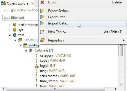 Next, right-click on the wlslog table and select Import Data as shown in Figure 29.