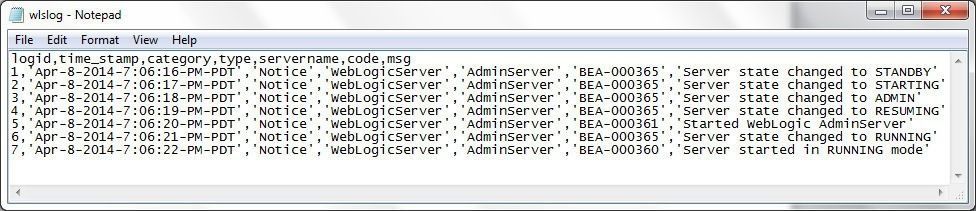 3,'Apr-8-2014-7:06:18-PM-PDT','Notice','WebLogicServer','AdminServer','BEA-000365','Server state changed to ADMIN'