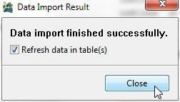 The Data Import Result dialog indicates that Data import finished successfully, as shown in Figure 33. Click on Close.