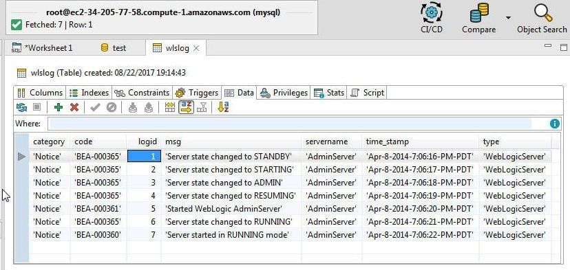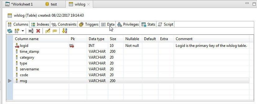 In the wlslog table detail click on the Data tab as shown in Figure 34.