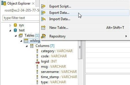 To export data right-click on the wlslog table and select Export Data as shown in Figure 36.