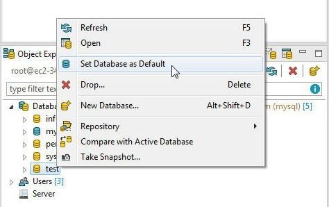 The database in blue (ish) color is the default (active) database. SQL scripts run in a Worksheet are run on the default database, which was called active database in Toad Edge 1.0. Only one database may be set as the default database. To set test as the default database right-click on test and select Set Databaseas Default as shown in Figure 8.