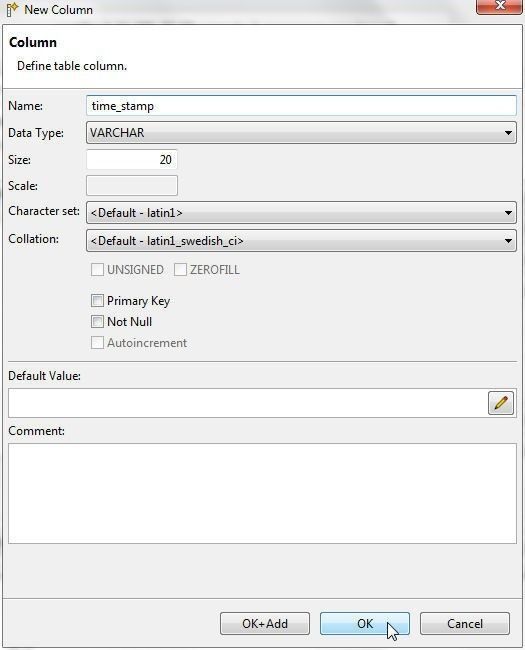 Add the time_stamp column of Data TypeVARCHAR with default Size (20), and default Character set (Default -latin1) as shown in Figure 20. Click on OK.