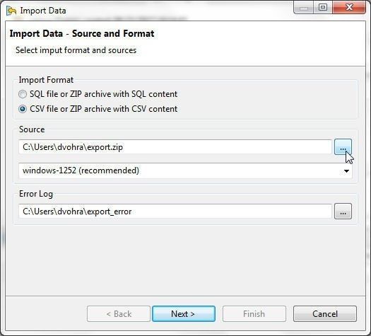 In the Import Data dialog select the Import Format as shown in Figure 30. Select the CSV file or ZIP archive with CSV content. Click on the browse button for the Source field to select the CSV file to import data from.