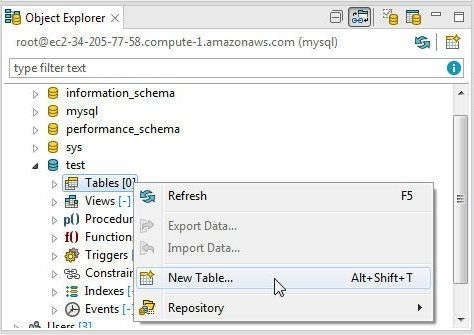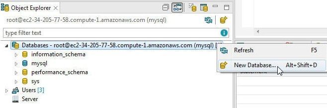 By default only the mysql database is created for a user and the other databases are system databases. To create a new user database right-click on the Object>Explorer>Databases node and select New Database as shown in Figure 1.