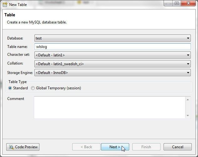 Specify a Table name (wlslog) and click on Next as shown in Figure 13.