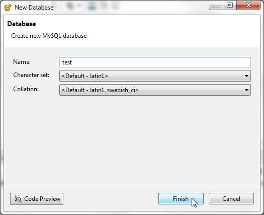 In the New Database wizard specify a database Name, test as an example, as shown in Figure 2. Click on Finish.