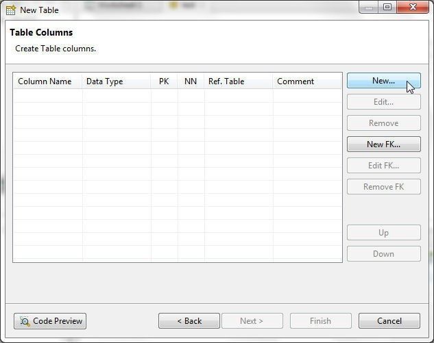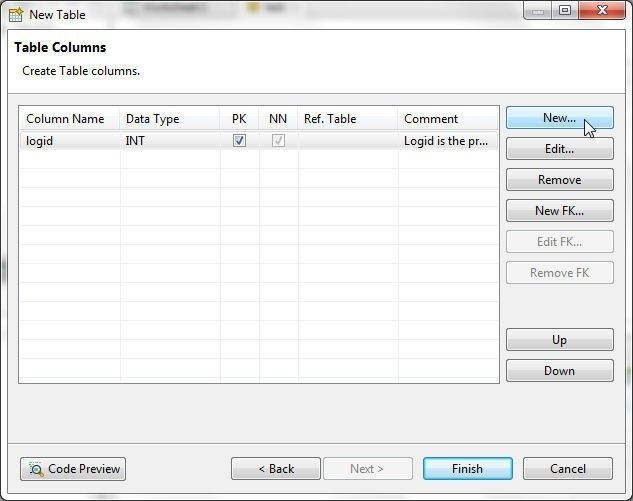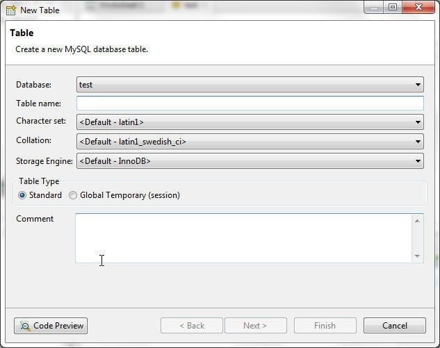 The New Table wizard gets started, as shown in Figure 12. Other than the Table name all the other fields have default settings. Comment is an optional field.