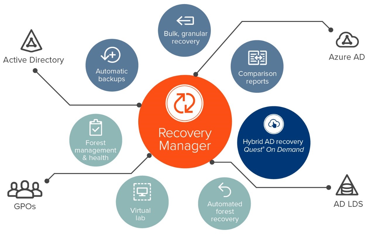 Caption: This image shows the full Recovery Manager for Active Directory Forest Edition, which enables online granular restores as well as automates the manual steps required to recover your entire domain or forest. Now, with the addition of Quest On Demand Recovery for Azure AD, you can also get secure Azure AD and Office 365 backup and recovery