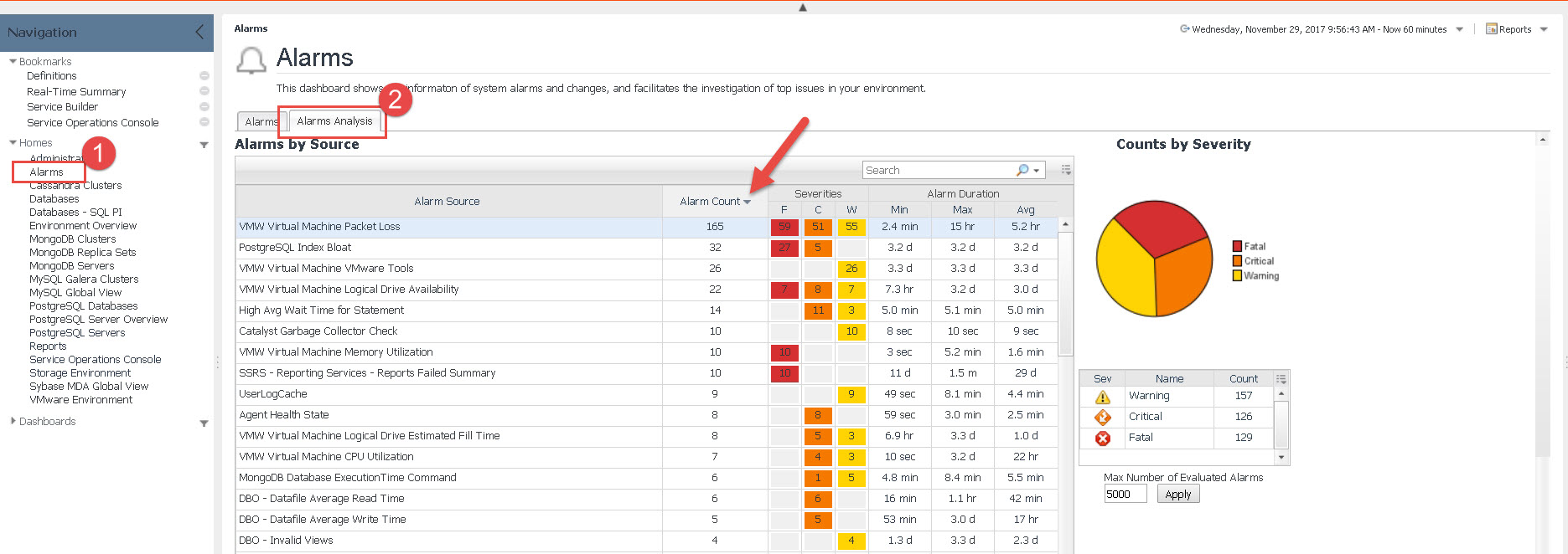 The quick way to see “what has fired” is to use the Alarms Analysis dashboard. Navigate to the Alarms dashboard, then Alarms Analysis tab. Pick a time range and then sort by Alarm Count.