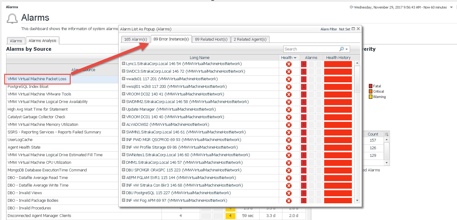 Clicking on an alarm in the Alarm Source column pops up additional detail. Select the “Error Instances” tab to see the objects (ie. devices, hosts, etc.) that the rule fired an alarm against.