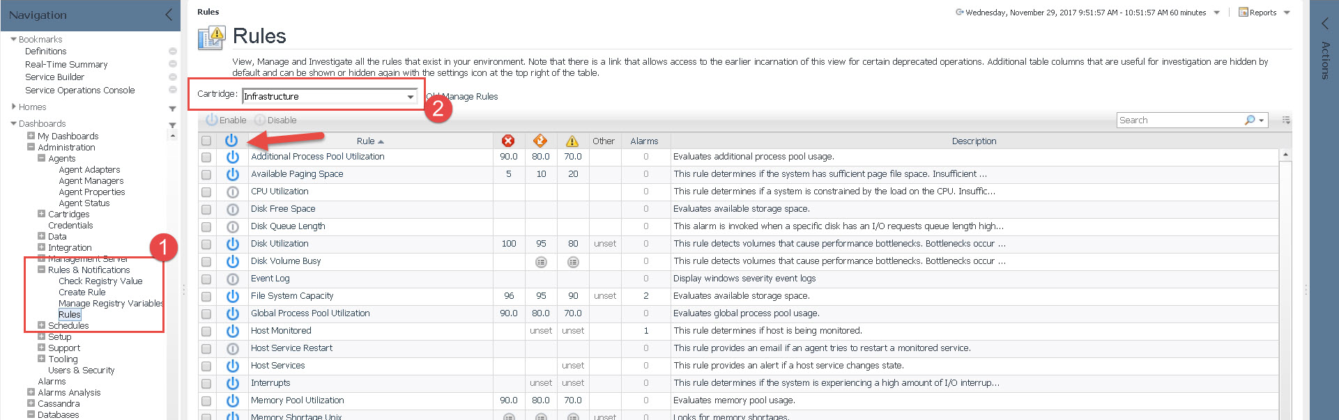 Next, go to the Rules dashboard, and pick the cartridge type from the pulldown. Normally it’s easy to see a 1:1 relationship from the prior dashboard, but sometimes it’s not. HostAgents generally fall under the Infrastructure cartridge. From there, we can see what rules are enabled for that type.